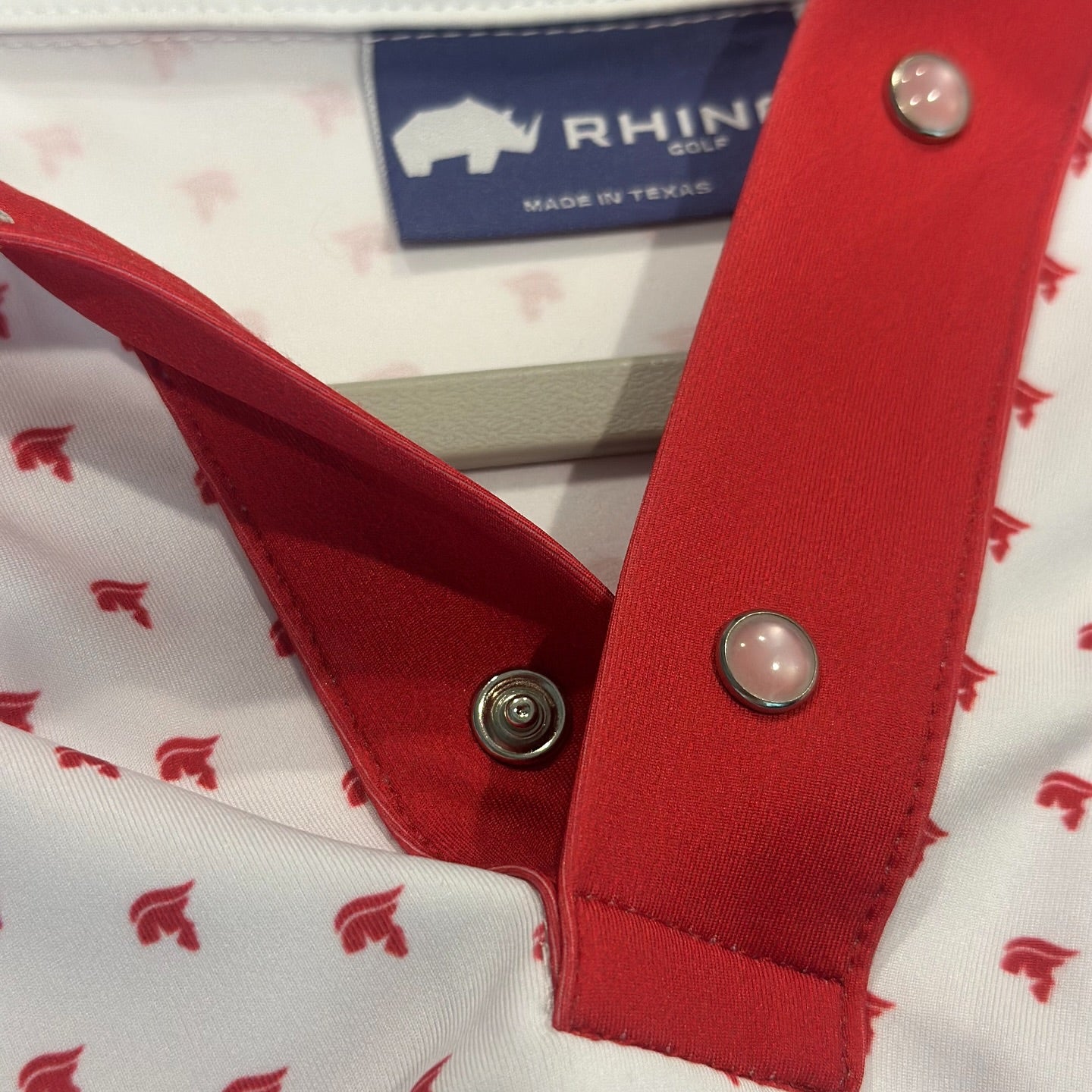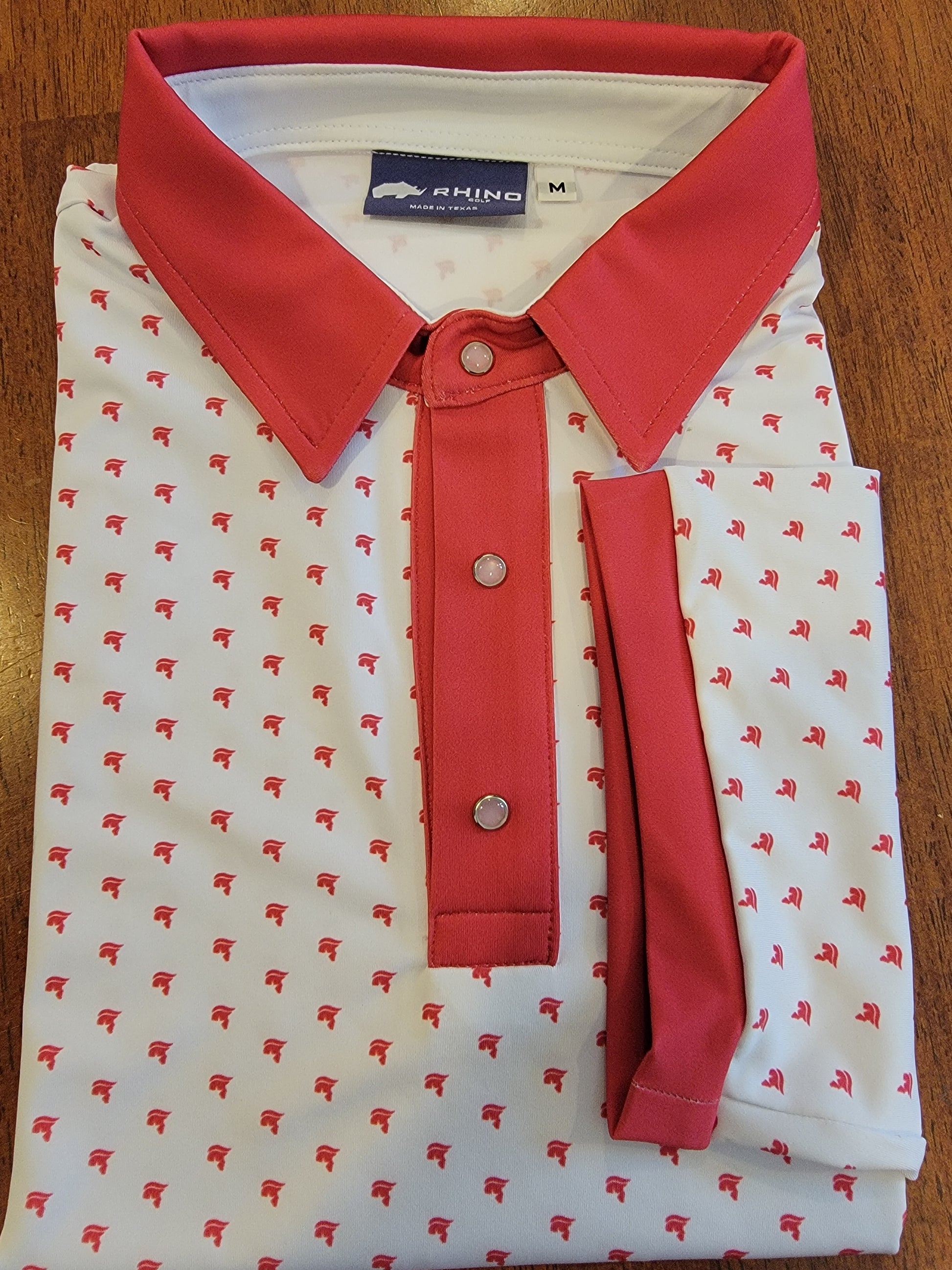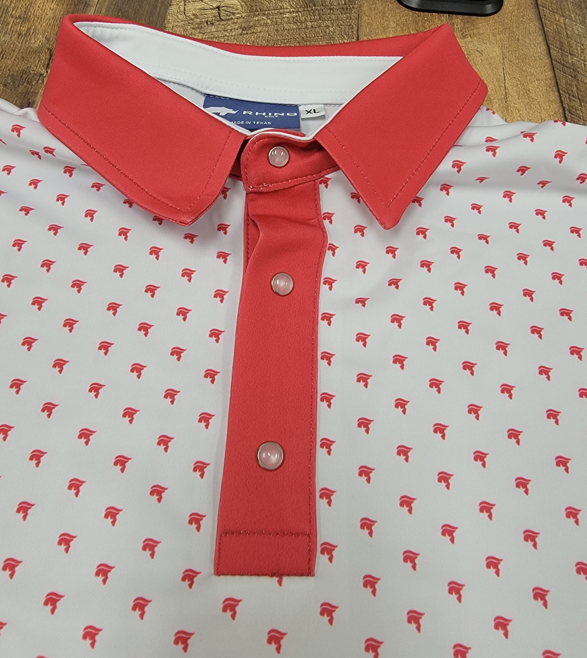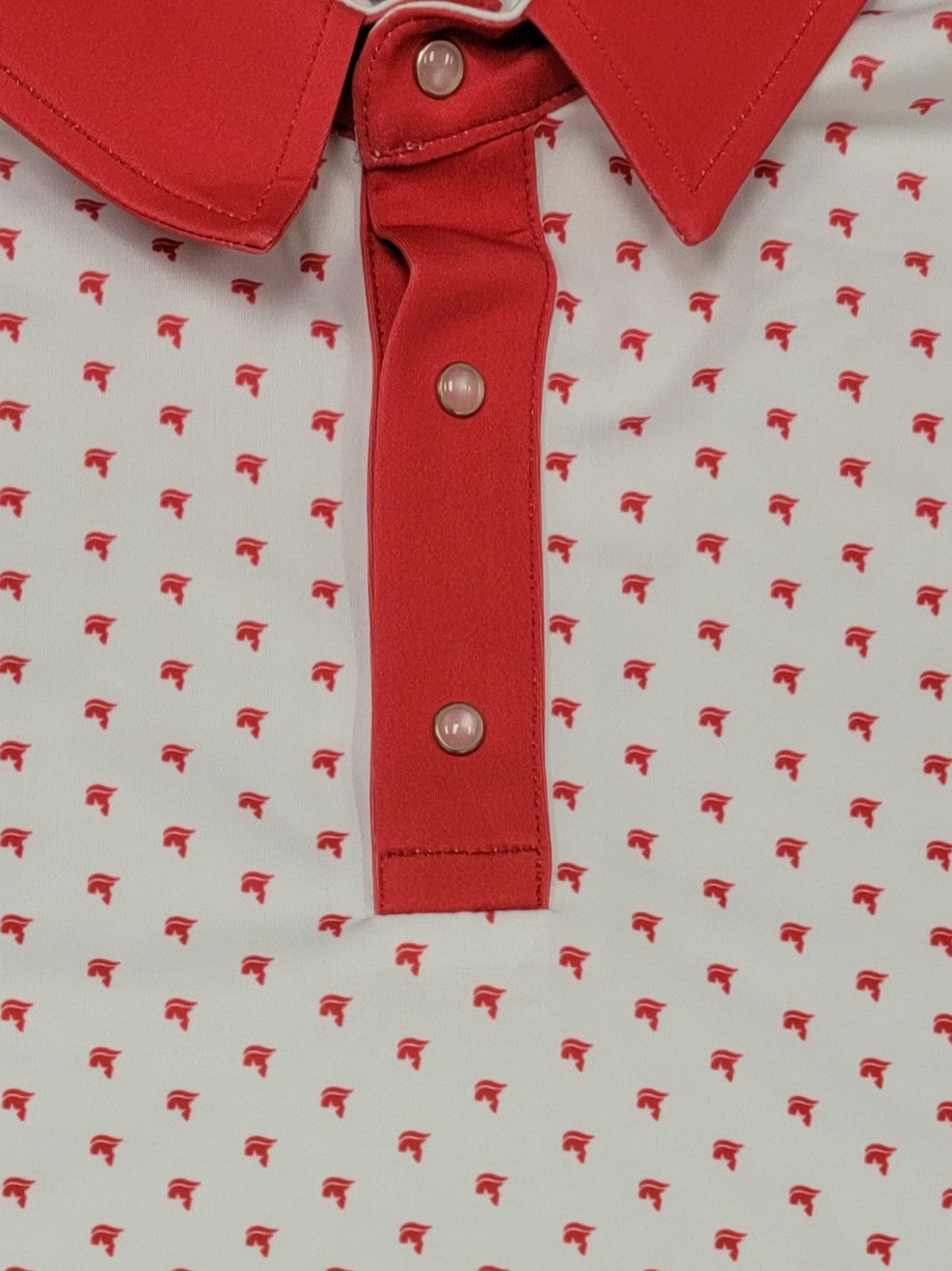 The Don features a crisp white base with bold red accents on the collar, collar stand, placard, and sleeve cuffs. Pearl snap buttons bring flair with a tailored twist, while a subtle scatter of little red Trump silhouettes adds unmistakable personality without saying a word.