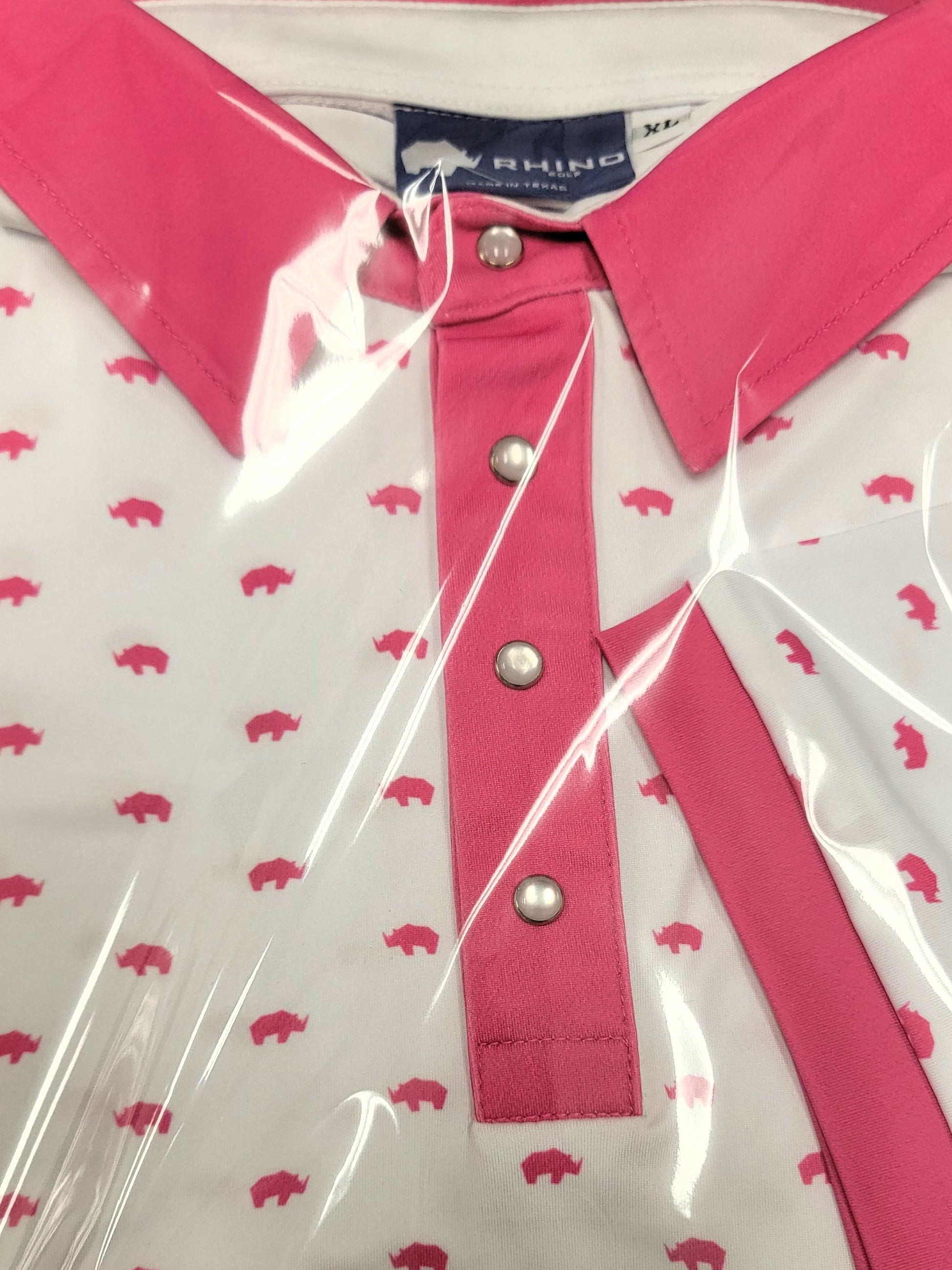 Pink with white collar & placket, white mini rhinos
